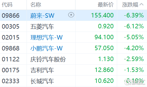 新能源汽车股延续弱势。蔚来、五菱汽车跌逾6%,理想汽车跌逾5%,小鹏汽车跌逾4%。
