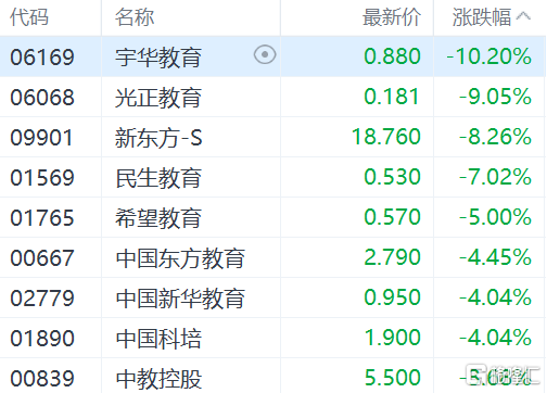 教育股集体走弱。宇华教育跌逾10%,光正教育跌逾9%,新东方-S跌逾8%,民生教育跌逾7%,希望教育跌5%