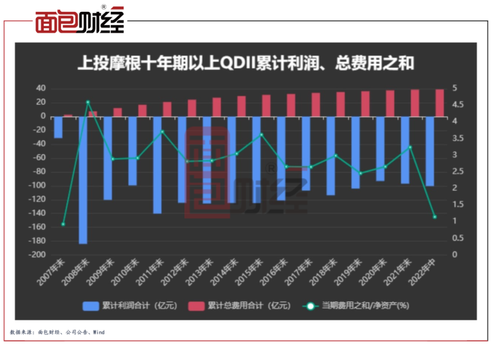 统计显示,上投摩根旗下成立十年以上3只QDII产品自成立至2022年6月底,累计亏损超过100亿元的同时,共收取了超24亿元管理费。若加上托管费、服务费等支出,截至2022年上半年末末,这3只QDII基金累计总费用接近40亿元。
