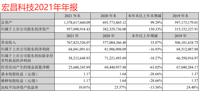 2021年,宏昌科技实现销售收入7.68亿元,同比增长33.07%;实现归属于上市公司股东的净利润6804.11万元,同比下降16.93%。加权平均净资产收益率年年下降,2021年“削减”了13.56%。