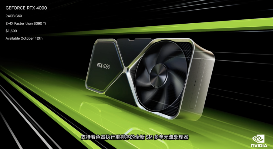 除了上述三大进步,RTX 4090还搭载一个用于DLSS 3像素处理的300TOPS光流加速器,总体处理吞吐量提升达4倍,相较于目前的旗舰GPU 3090Ti,RTX4090使游戏“微软模拟飞行”速度提升达2倍,使游戏“传送门”RTX版的速度提升达3倍,使“RacerX”的速度提升达4倍。作为全新重量级冠军产品,RTX 4090的建议零售价为1599美元起,将于10月12日上市。