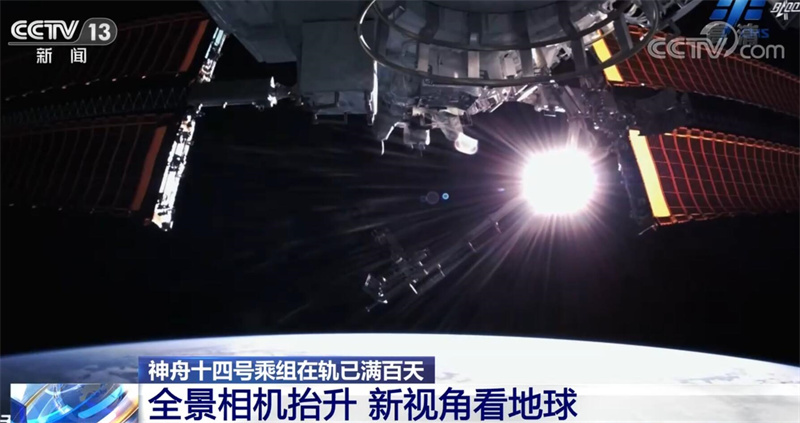 我们现在看到的画面是由中国空间站问天舱外全景相机B拍摄的,这段画面和以往有所不同。前几天,神舟十四号航天员乘组在执行首次出舱任务时,完成了对问天舱外全景相机B的抬升工作,这段画面就是抬升后的全景相机拍下的地球与太阳翼相互映衬的画面,镜头里一侧是蓝色的星球,一侧是展开的橙色柔性太阳翼,当太阳的光芒照在上面时,那真的是光彩夺目、美不胜收。