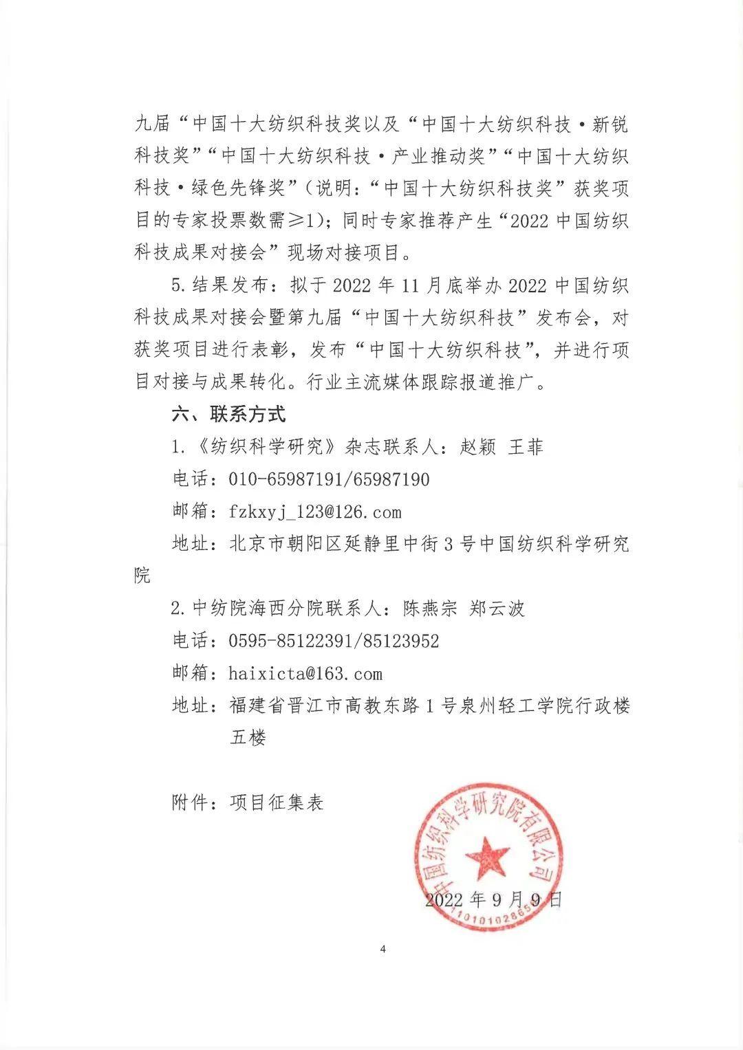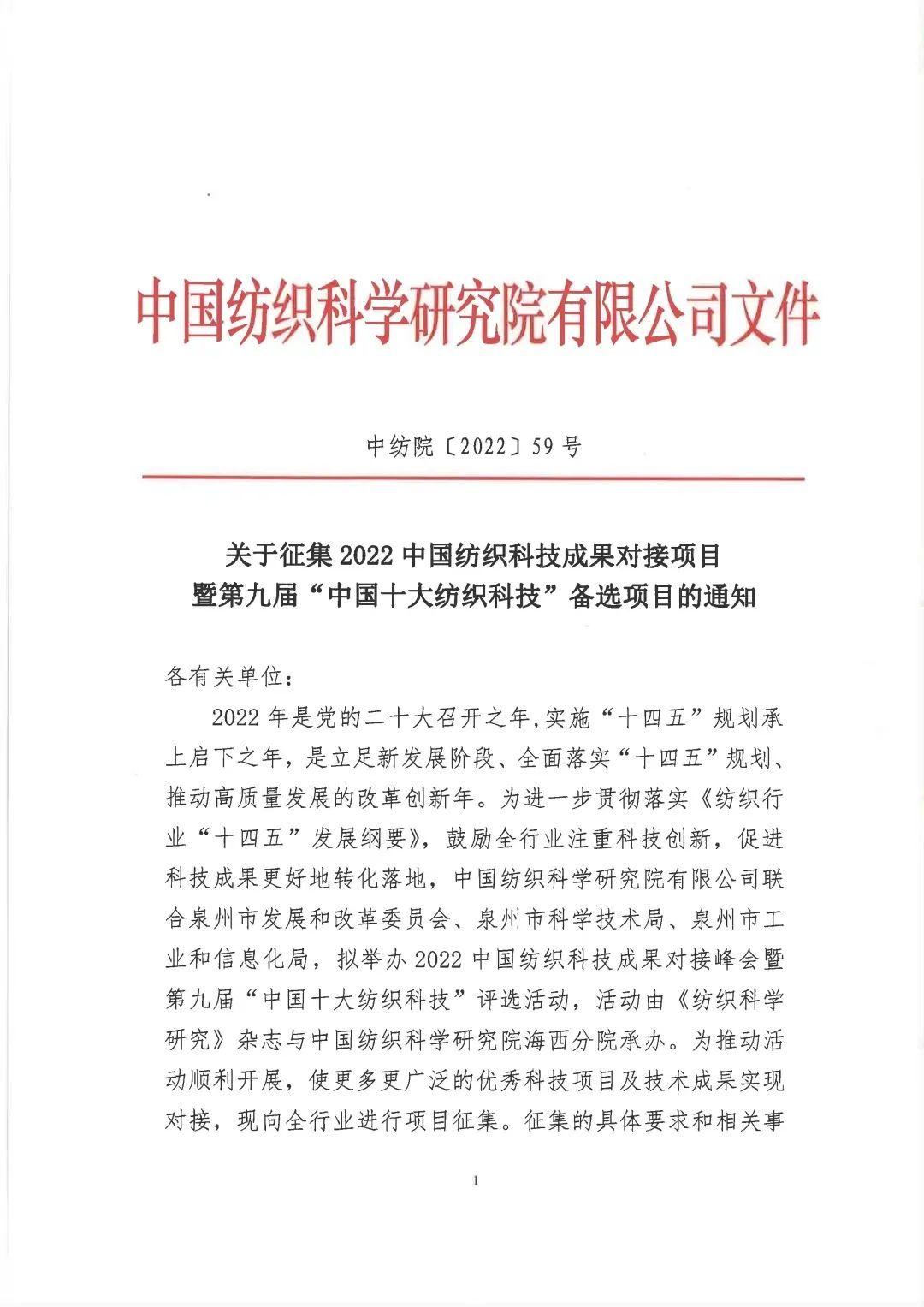 2022年是党的二十大召开之年,实施“十四五”规划承上启下之年,是立足新发展阶段、全面落实“十四五”规划、推动高质量发展的改革创新年。为进一步贯彻落实《纺织行业“十四五”发展纲要》,鼓励全行业注重科技创新,促进科技成果更好地转化落地,通用技术中国纺织科学研究院有限公司联合泉州市发展和改革委员会、泉州市科学技术局、泉州市工业和信息化局,拟举办2022中国纺织科技成果对接峰会暨第九届“中国十大纺织科技”评选活动,活动由《纺织科学研究》杂志与中国纺织科学研究院海西分院承办。