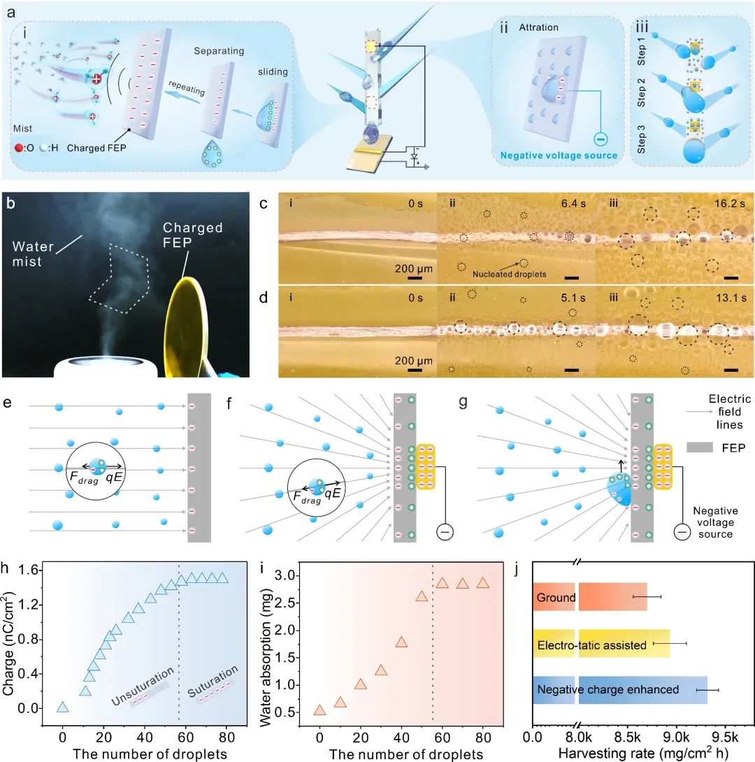 几乎所有已知的材料都具有接触起电效应,水滴与聚合物在接触分离时同样会发生电荷转移。该研究首次揭示了水收集表面与雾滴之间存在的静电吸附现象,并将其用于辅助增强水收集。最终水收集效率高达93.18 kg/(m2·h),高于目前已知仿生甲虫和仙人掌的雾收集器。