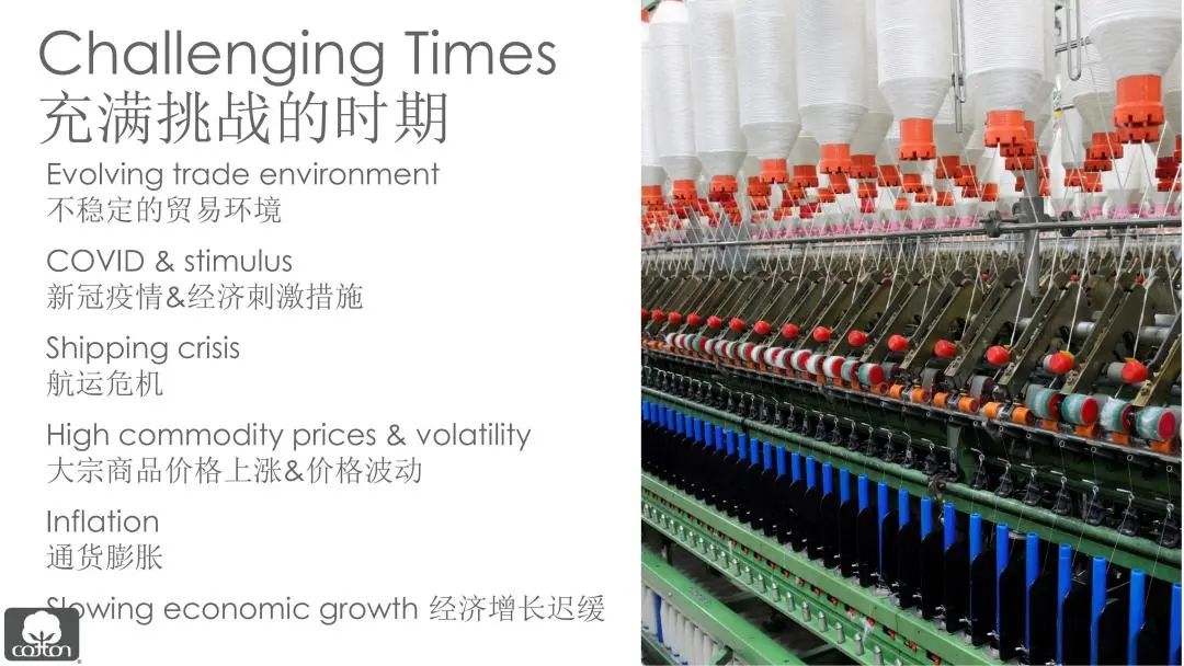 通货膨胀和利率上升将使需求放缓,这将带来的一个积极影响是物流业可能得以恢复。物流问题的解决可以缓解价格的上行压力。“随着棉花市场和宏观经济条件的不断演变,不确定性仍然是市场的主基调。”傅培花强调道。