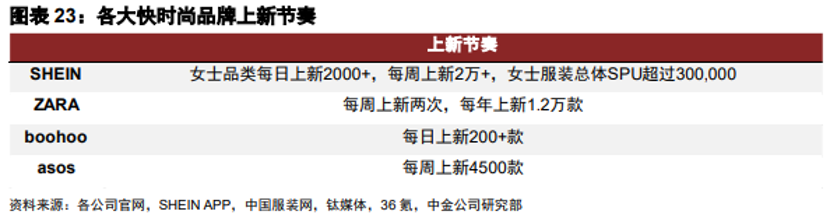 快时尚品牌“唯快不破”。SHEIN曾经能很快赶超ZARA,就在于做到了比ZARA还快。据中金研报,SHEIN一款新品从设计到成品只需要7-15天,每周上新SPU(标准产品单位)可超2万个。“这个周转速度超过了全球任何一家快时尚公司”,胡天说。