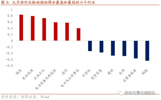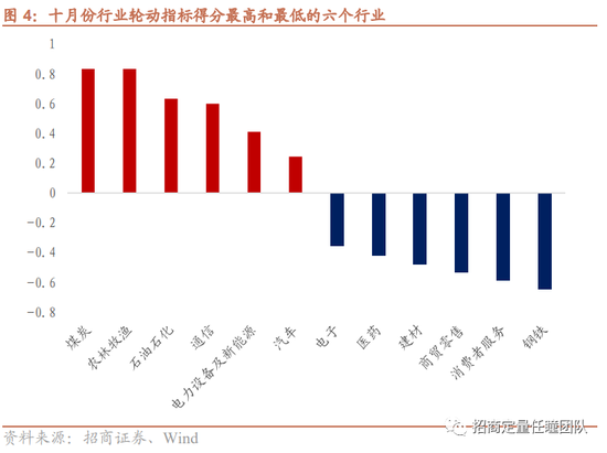 截止最新数据,我们计算了十月份的“预期共振”行业轮动指标。根据指标得分,排名靠前的行业有煤炭、农林牧渔、石油石化、通信、电力设备及新能源、汽车、建筑和家电。