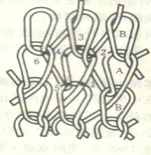 (2)、针织物:由纱线编织成圈而形成的织物,分为纬编和经编。a、纬编针织物是将纬线由纬向喂入针织机的工作针上,使纱线有顺序地弯曲成圈,并相互穿套而成。b、经编针织物是采用一组或几组平行排列的纱线,于经向喂入针织机的所有工作针上,同时进行成圈而成。