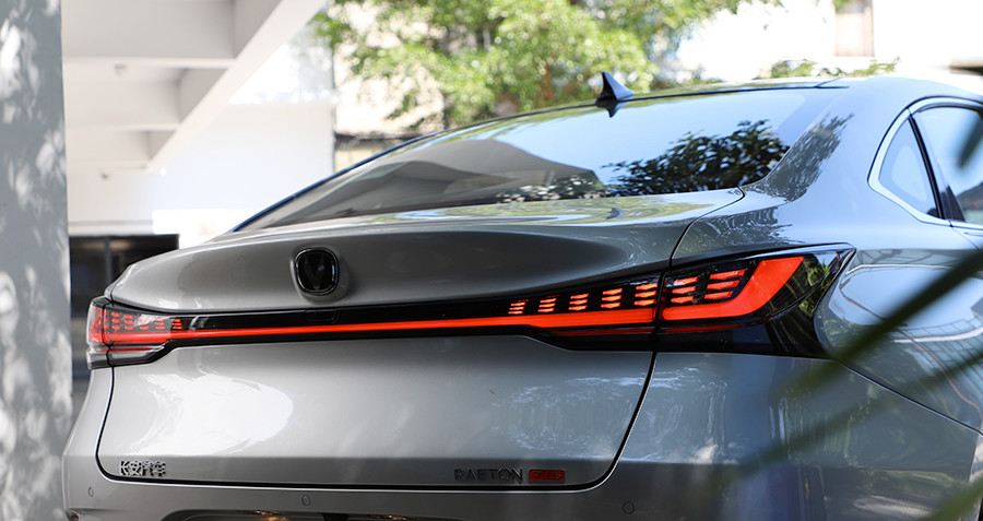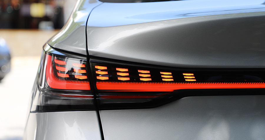 反观后尾灯组部分,贯穿式设计足够主流,且LED灯带点亮后光感均匀,精致感满满。只不过两侧主灯组内刹车灯采用点阵式排列,点亮后整个灯组过于饱满,显得有些臃肿。如果两侧主灯组内点阵式排列刹车灯数量进行减少,且LED行车灯带在两端改为弧线设计,相信会更符合整车简洁流畅的设计风格。