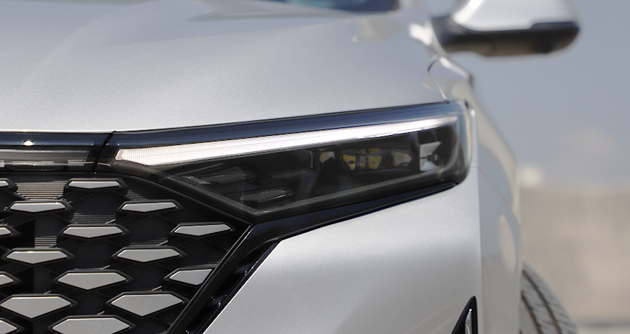 灯组设计部分,前LED日行灯以及后LED行车灯均采用贯通式设计,整体点亮后精致度和辨识度很高。特别是前大灯组,整个灯组扁平紧凑,上方为LED日行灯,内部则为非常精致且小巧的主灯组,为远近光一体式设计,加上灯组前后的装饰搭配,体现出了长安品牌的超高的制造水准。