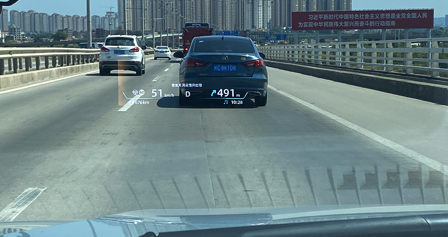 同时,锐程PLUS还拥有AR-UD增强现实抬头显示功能,拥有7.5m远距离虚拟成像能力,可实现52英寸超大投影。这套AR-HUD给人最直观的感觉是,投影尺寸真是很大,同时能够显示超多信息,如车速、导航、音乐、辅助驾驶以及歌词等等。同时结合导航可实现实景导航,在临近转弯时刻通过渐变指示指令,进行动态动画引导,避免错过重要路口。